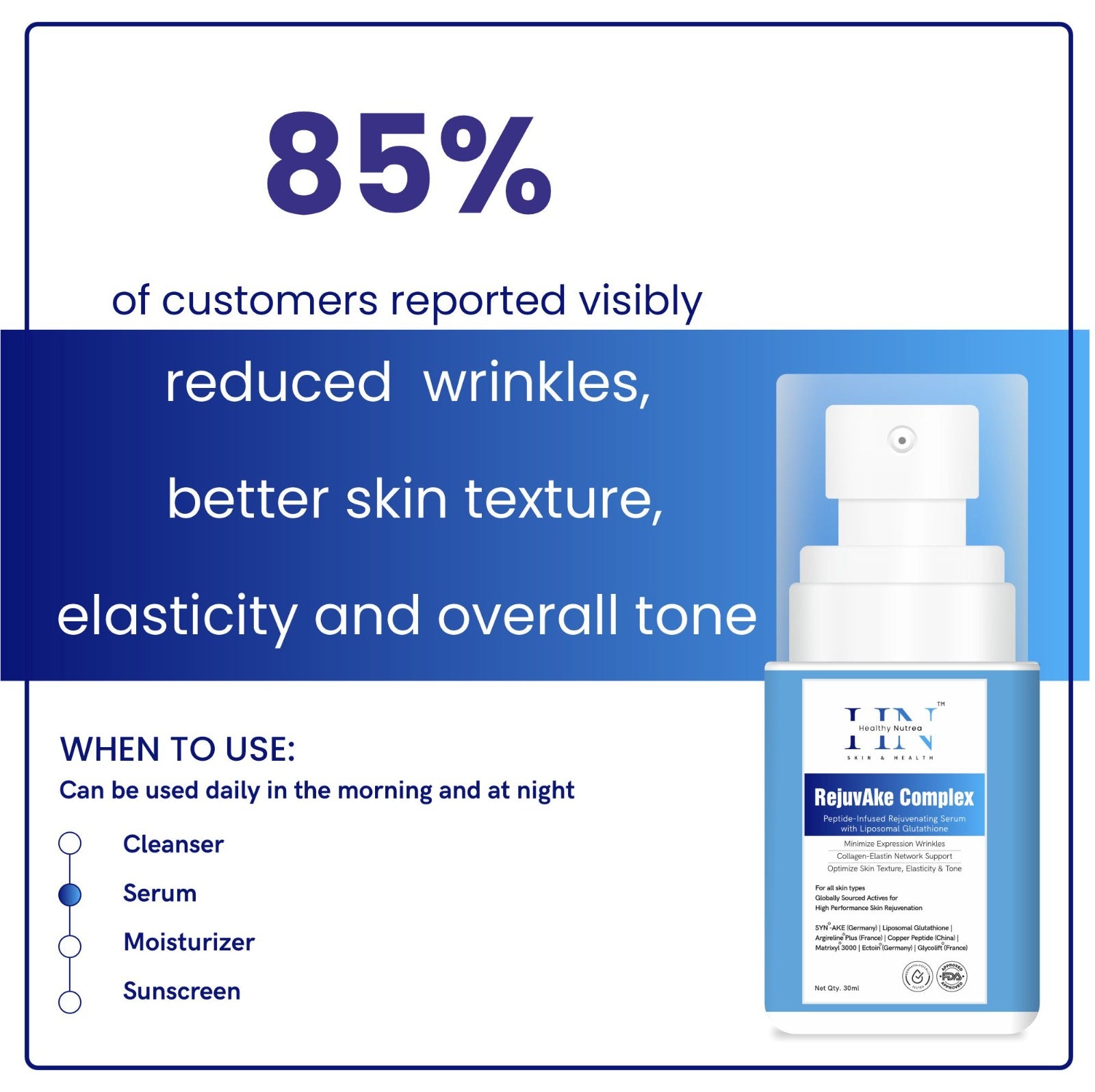 RejuvAke Complex works deep within the skin to minimize expression wrinkles, support the collagen-elastin network, and restore firmness, elasticity, and youthful radiance.